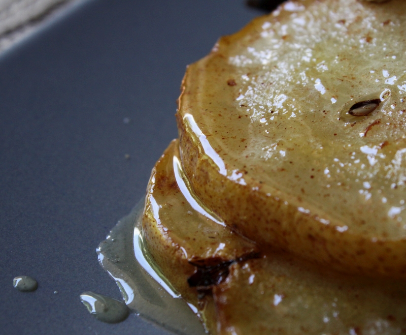 This simple, but beautiful recipe was inspired by the abundance of  fresh pears in my part of the world now that autumn is fully upon us. The mornings and evenings are chilly and we are looking around for something warm to eat in the morning. This dish is a great alternative to porridge or eggs for breakfast. I used beurre bosc pears, with their intriguing mottled brown skin, and heavy juiciness; perfect for grilling until soft, but still able to hold their shape. What a wonderful way to start an weekend autumn morning.