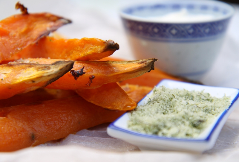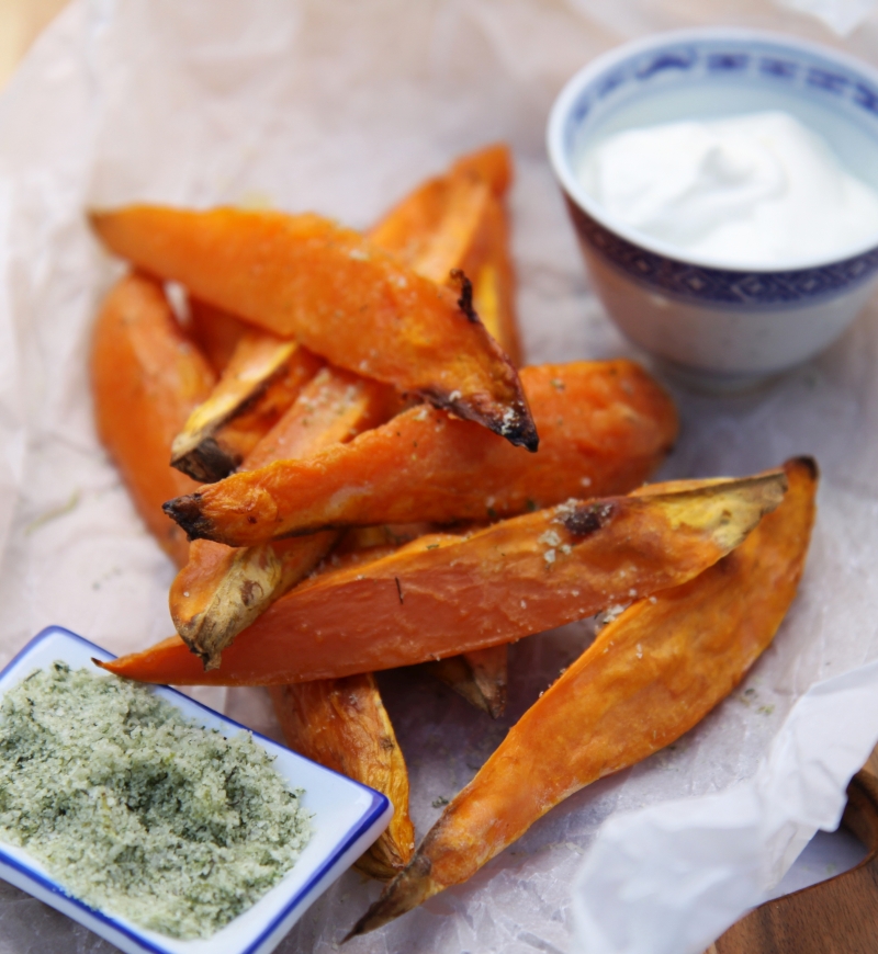 My family fell in love with sweet potato wedges long before they became a cafe staple, principally because roast sweet potatoes were also a family favourite. I wanted something that was a little more healthy, and these oven baked wedges were perfect. They only use a little bit of olive oil, are seasoned with salt infused with fresh thyme, and dipped in tangy greek yoghurt for a smooth and creamy finish.