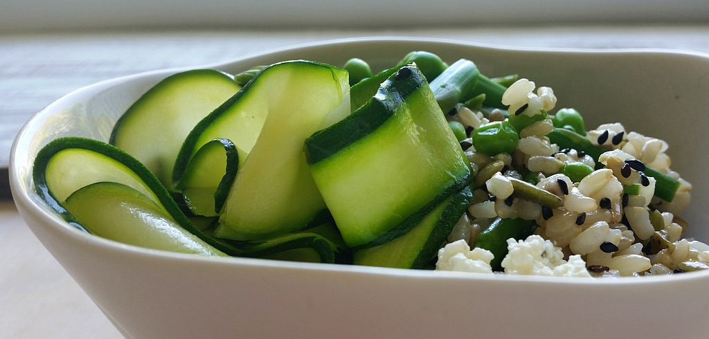 A week’s holiday in the middle of summer has been an opportunity to rest and relax before the busy year really begins in earnest. It’s been stiflingly hot in my part of the world, so hot that a very fit man in his early thirties died of heat stroke over the weekend while biking in a nature reserve just north of Brisbane. So outdoor projects have been taken off the agenda, besides keeping the garden alive by watering in the late afternoon. Instead, I have been reading, finishing a quilt and spending lots of time in the kitchen. Creating new recipes is something that relaxes me, and this season has been one of trying to incorporate more seeds and nuts into my diet, both for the health benefits and for their taste. This rice salad was today’s experiment. The fresh peas, asparagus and zucchini sit atop a bowl of brown rice, seasoned with rice wine vinegar and a little olive oil, and stirred through are pepitas, sunflower seeds and black sesame seeds. I ate it on its own, but this salad would also be delicious as a side with grilled salmon.